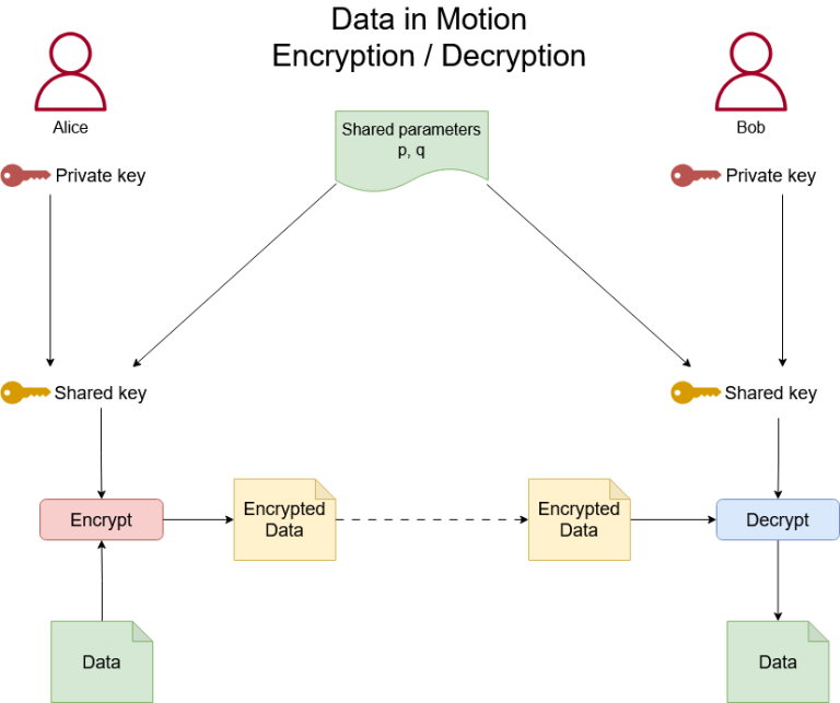 Data in motion is almost exclusively protected by the Diffie-Hellman (DH) or Elliptic Curve Diffie-Hellman (ECDH) key exchange. This protocol allows two parties to establish a shared secret over an untrusted wire.