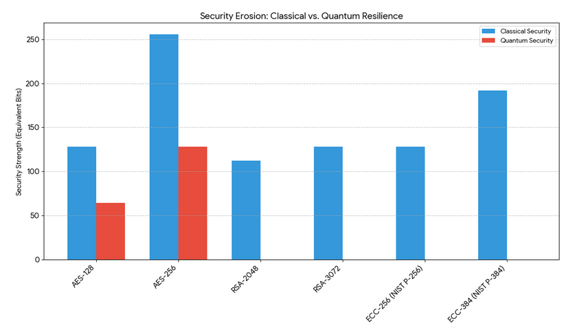 The data below illustrates the stark reality of the “Quantum Gap.” While symmetric encryption (AES) survives by having its security halved, asymmetric encryption (RSA and ECC) – the foundations of the modern internet – is effectively reduced to zero security by Shor’s Algorithm.