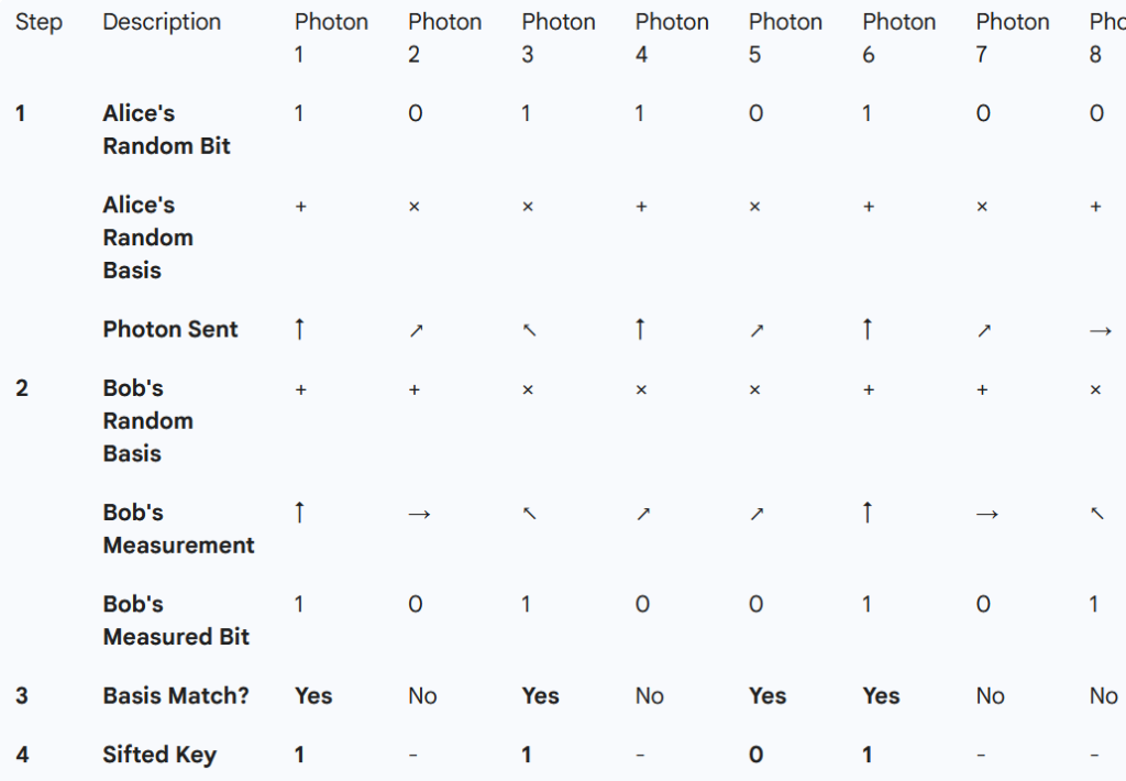 - The Reveal (Sifting): Alice and Bob talk on the public channel. They tell each other which basis they used for each photon (e.g., “For photon #1, I used Rectilinear”). They never reveal the actual bit value.