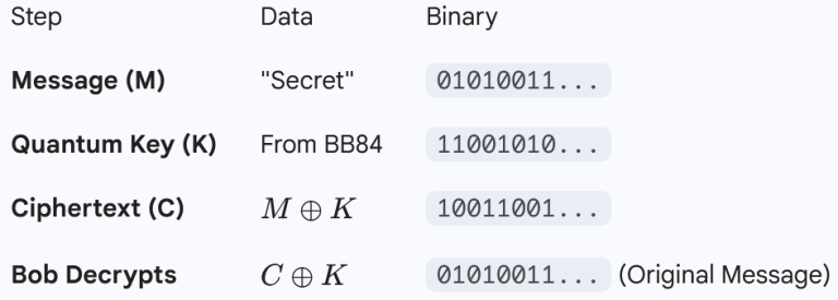 Because the key K was generated via the random quantum process of BB84 and is only used once, the ciphertext C contains zero information about the message without the key. It looks like pure, random noise.