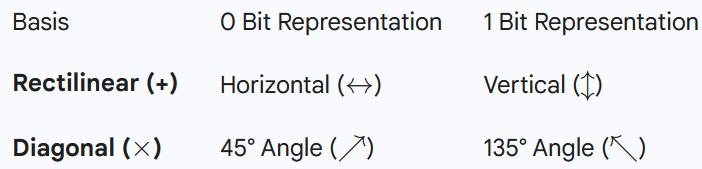 - Transmission: Alice generates a random string of bits (0s and 1s). For each bit, she randomly chooses a basis (+ or ×) and sends a polarized photon to Bob.