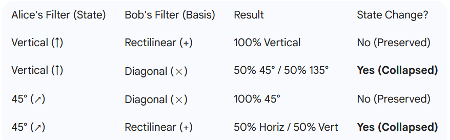 Crucially: Once the photon passes through Bob’s Diagonal filter, its original “Vertical” identity is destroyed. It has collapsed into a new state.
